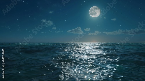 A romantic night scene of the sea, with a full moon hanging high in the sky, its light dancing on the water and illuminating the horizon