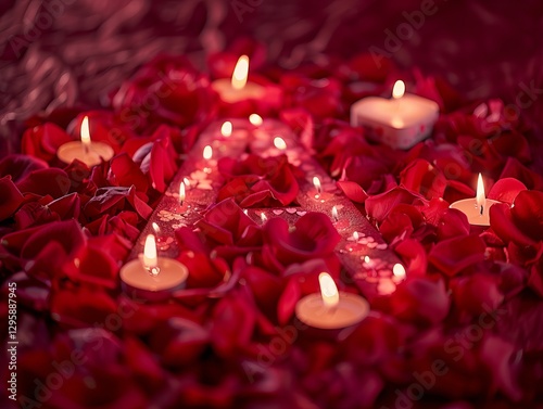 A romantic scene featuring red rose petals and candles arranged around a decorative letter A, creating a warm and intimate ambiance.