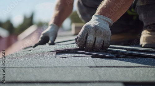 A roof worker installing shingles at a construction site. Featuring skill and safety