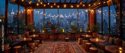A rooftop lounge with city views, lit by warm string lights and candles, creating a cozy ambiance.
