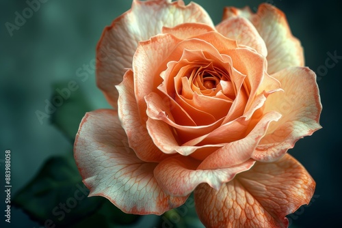 A rose with petals that have the delicate color and texture of pink, pale peach or apricot
