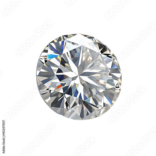 A rotated top-down view of a round diamond gem, isolated, highlighting its brilliant facets and sparkling clarity.