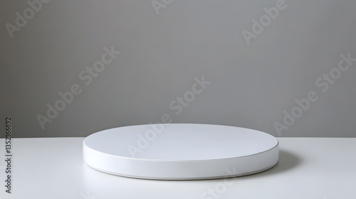 A round display stand sits on a white table against a soft gray backdrop, ideal for product presentation