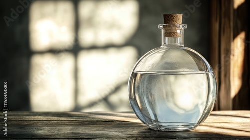 A round glass bottle filled with clear water, resting on a wooden surface with soft lighting.
