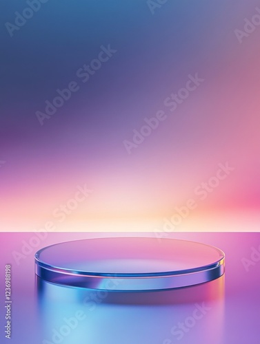 A round glass podium set against a gradient background, a vector illustration in a colorful, minimalist style with blue and purple tones.