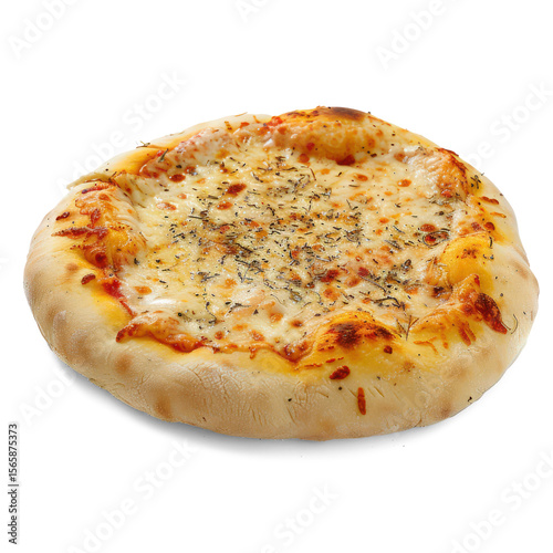 A round, golden-brown pizza with melted cheese and herbs on a transparent background.