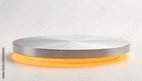 A round metal platform with a brushed silver surface and a warm orange light emanating from underneath, against a plain white background