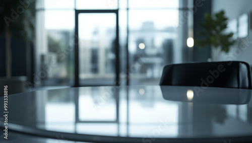 A round, white table with a black chair in front of large windows. Blurred city view beyond