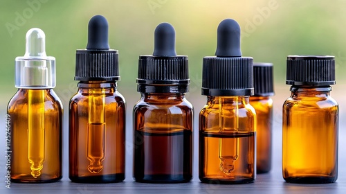 A row of amber glass bottles with droppers on a table