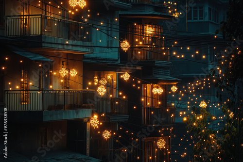 A row of apartment buildings lit up with Christmas lights