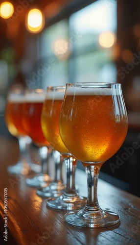 A row of beer glasses filled with golden ale on a wooden bar counter, creating a warm and inviting atmosphere at a pub. The image highlights relaxation, drinks, and social gatherings.