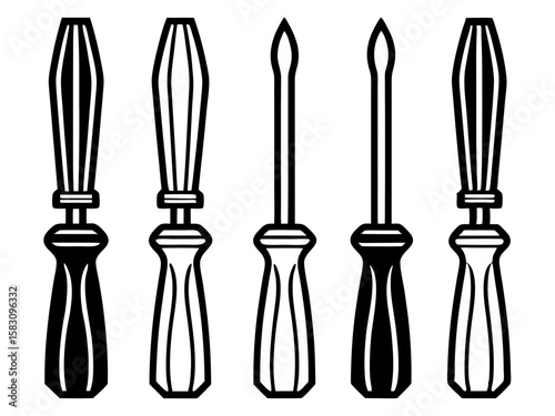 screwdriver, tool, tool, hand tool, hardware, fix, repair, construction, bricolage, illustration, graphic, icon, vector, black-and-white, monochrome, set, collection, row, line, pointed, handle, metal, workshop, manual, equipment, instrument, fastener, screw, work, design, simple, clean, outline
