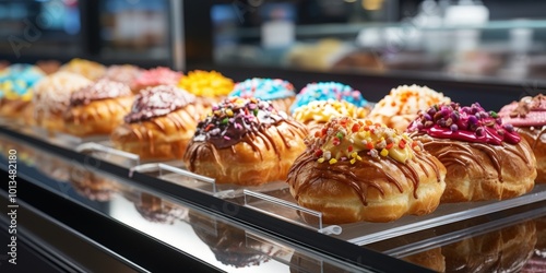 A row of freshly baked donuts, glazed and sprinkled with colorful toppings, sits on a display case, promising a sweet and satisfying treat.