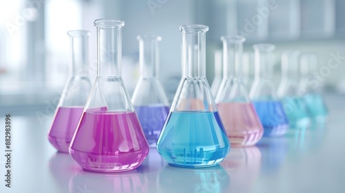 A row of glass beakers with different colored liquids in them