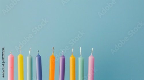 A row of lit colorful birthday candles standing out against a blue background, vividly symbolizing celebration and joy