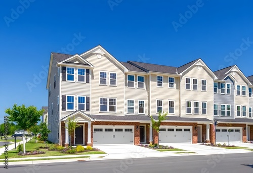 A row of modern townhouses with beige siding, blue shutters, and attached garages. The houses are set against a clear blue sky