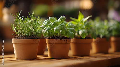A row of potted herbs, including rosemary, basil, and mint, sit on a wooden table. Sunlight streams through the window, highlighting the fresh, green foliage.