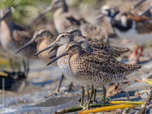 A row of Short-billed Dowitchers resting on the shoreline of the Delaware Bay during their spring migration