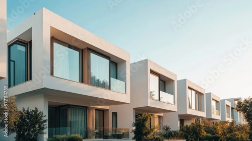 A row of ultra-modern white townhouses with sleek, minimalist designs and large floor-to-ceiling windows.