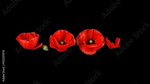A row of vibrant red poppies with black background, showcasing the intricate details of these delicate flowers in various stages of bloom