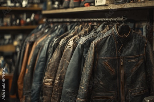 leather jacket, vintage, retro, classic, fashion, clothing, apparel, outerwear, style, men's fashion, clothes rack, collection, display, rack, hanger, shop, store, retail, texture, leather goods, hand-made, craftsmanship, quality, durability, timeless, rugged, cool, stylish, iconic, biker, rebellion, freedom