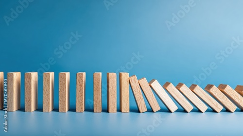A row of wooden dominoes in varying positions against a blue background, illustrating the concept of cause and effect.