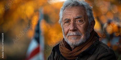 A rugged man with a beard and scarf stands on a busy autumn street, his weathered face adorned with wrinkles and a distinguished moustache, a portrait of a senior citizen in the midst of the changing