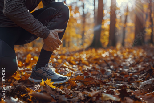 runner, pain, leg, autumn, exercise, jogging, forest, fallen leaves, sunlight, nature, outdoors, injury, kneeling, physical exercise, fitness, running, fall, seasonal, sport, training, trail, endurance, healthy lifestyle, active, foliage, natural light, recovery, athletic, scenery, knee, autumn color, park, physical activity, stretching, autumn leaf, cardio, warmup, activewear