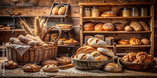 bread, loaf, basket, bowl, rustic, wooden, bakery, display, table, wheat, flour, dough, baking, pastry, baked goods, kitchen, pantry, farmhouse, country, rural, grain, brown, natural