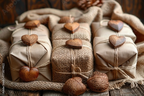 A rustic burlap gift box tied with twine and accompanied by scattered wooden heart cutouts professional photography