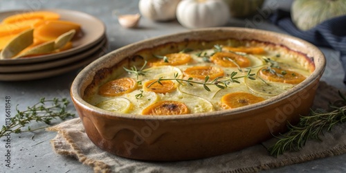 casserole, gratin, potato, squash, thyme, rosemary, baked, creamy, dish, rustic, autumn, fall, comfort food, side dish, dinner, vegetarian, vegan, healthy, food photography, kitchen, home cooking, delicious, homemade
