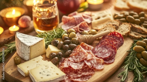 rustic, charcuterie, board, adorned, array, artisanal, cheese, cured, meat, olive, crusty, bread, slice, centered, soft, candlelight, casting, cosy, glow, widener, drizzle, honey, sprig, rosemary, elegant, touch