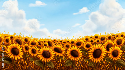 A rustic digital illustration of a sunflower field under a bright blue sky with fluffy clouds, evoking warmth, joy, and summer vibes