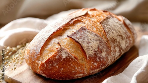 rustic, loaf, artisan, bread, crispy, gold, crust, placed, wooden, cutting, board, centered, angled, perspective, soft, warm, light, highlighting, texture, minimalist, setting, clean, linen, clothes, partially, covering, simple, authentic, bakery, style