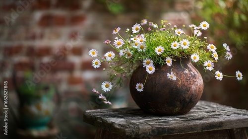 A rustic pot brimming with delicate daisies sits on a weathered wooden table, exuding charm and tranquility.