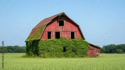 A rustic red barn overgrown with greenery stands tall in a serene field, symbolizing nature's reclaiming of farmland.