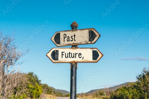 A rustic signpost with arrows pointing towards the past and future stands against a clear blue sky, evoking themes of choice, reflection, and life's journey.