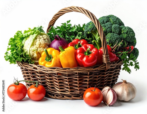 basket, wicker, vegetable, fresh, vibrant, colourful, red, yellow, green, purple, broccoli, cauliflower, lettuce, bell pepper, tomatoes, garlic, onion, healthy, alimentary, diet, food, produce, harvest, garden, farm, organic, natural, bounty, abundance, wholesome, delicious, crisp, succulent, vitamin, mineral, antioxidant, lifestyle, eating, cooking, receipe, ingredient, white, background, display, presentation, full, overflowing, rustic, dark