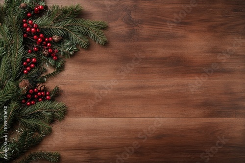 A rustic wooden background adorned with vibrant red berries and lush green leaves, perfect for seasonal decor.