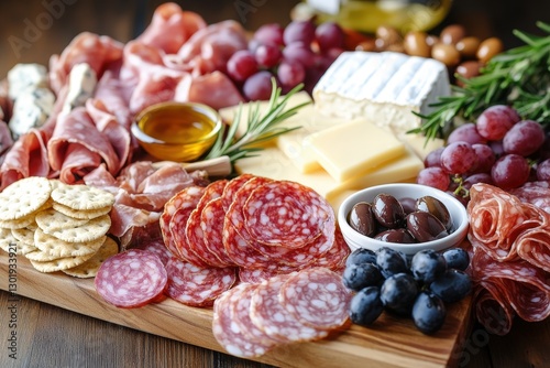 cheese, meat, succulent, rustic, wooden, board, display, culinary, rich, feast, thanksgiving, christmas, new year's eve, easter, 4th july, warmth, cosiness, comfort, indulgence, elegance, epicure, sophistication, gastronomy, celebration, abundance, texture, pattern, natural, earthy, artisanal, favor, aroma, mouth-watering, tradition, festivity, nostalgia, authenticity, variety