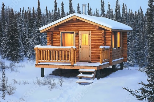 a rustic wooden cabin in the snowy alpine forest at golden hour