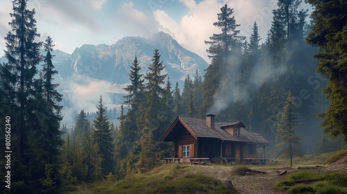 A rustic wooden cabin nestled amidst towering pine trees, with smoke lazily curling from its chimney into the crisp morning air.
