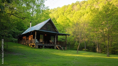 A rustic wooden cabin surrounded by a green forest in the spring pic