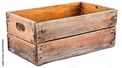 A rustic wooden crate, weathered and natural, isolated on a white background, perfect for showcasing vintage decor or farm themes