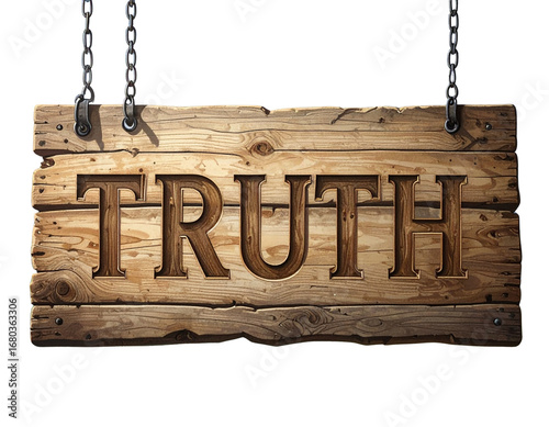 A rustic wooden signboard with the word “Truth” carved into the surface, suspended by 195643