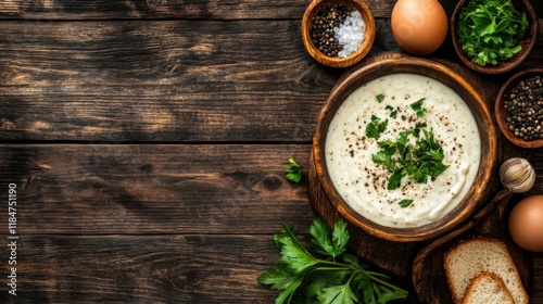 A rustic wooden table set with a large bowl of fettuccine Alfredo, creamy sauce glistening, garnished with parsley and freshly cracked pepper for flavor.