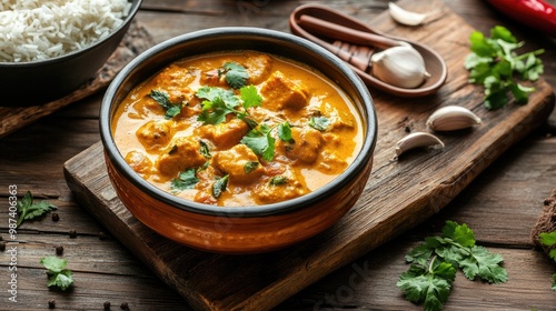 A rustic wooden table with a bowl of hot rice next to a pot of curry, showcasing the perfect pairing of flavors in a comforting meal.