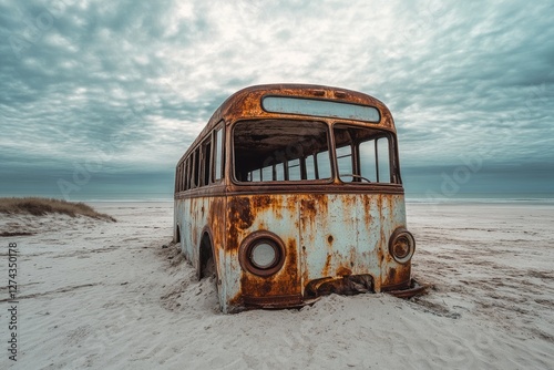 A rusty, derelict bus sits half-buried in the sand on a beach under a cloudy sky.