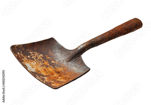A rusty metal shovel, isolated on black. The shovel's blade and handle are heavily coated in orange-red rust