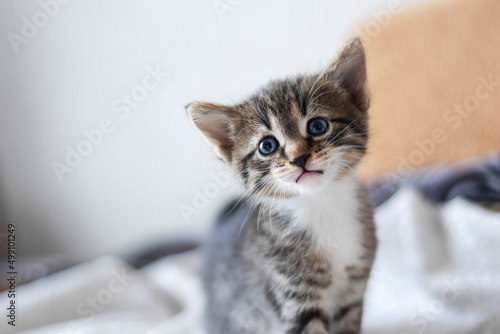 A sad five-week-old kitten on a defocused background. Shallow depth of field